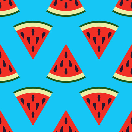 青の背景にシームレスなスイカのかわいいパターン 甘い夏のフルーツのためのベクトル図を設計します 生鮮食品の飾りにスライスします 壁紙をかなり繰り返します 明るいおいしい漫画の装飾のイラスト素材 ベクタ Image